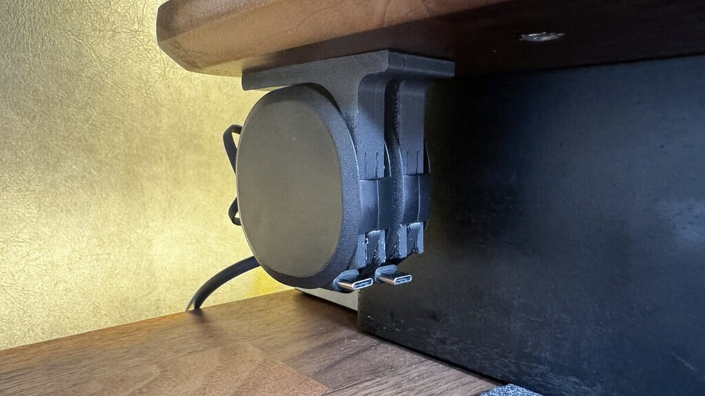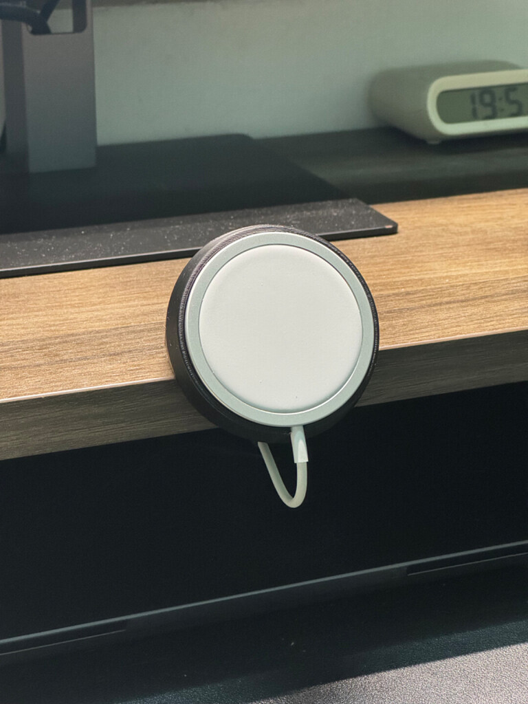 充電器をデスクの側面に固定。置くだけで充電が始まる「専用ドック」が手軽に作れます。