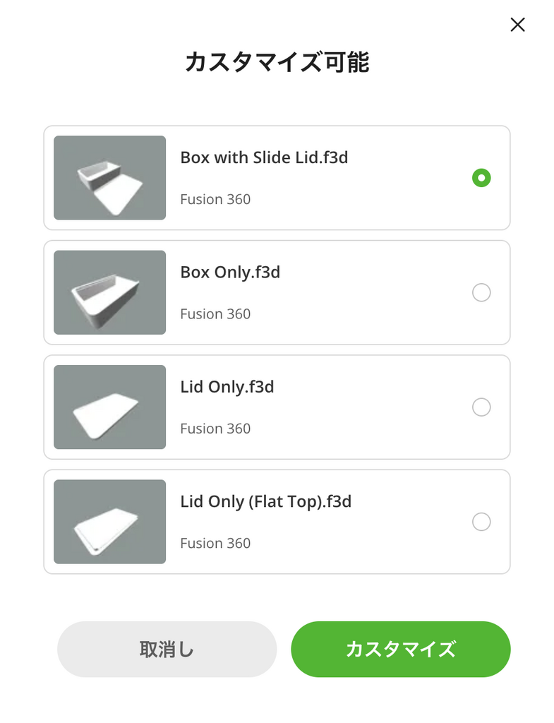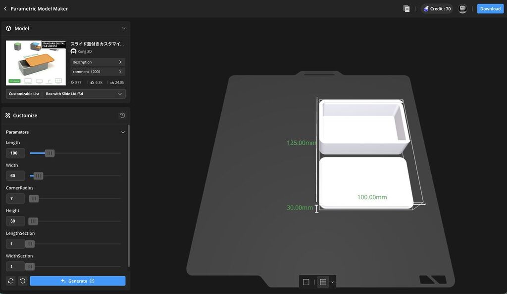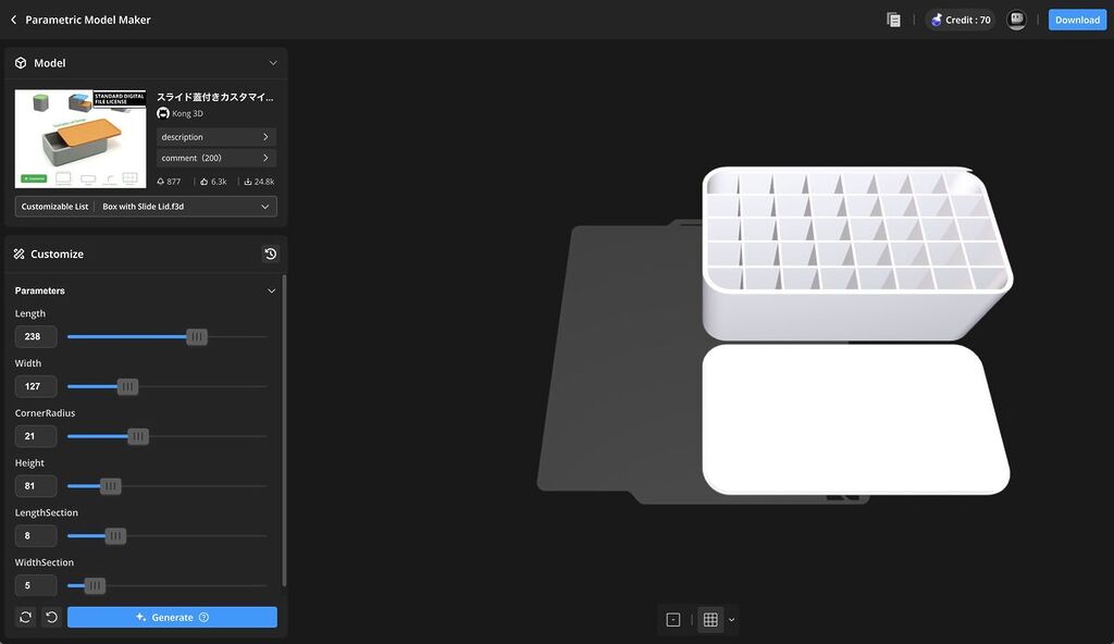 例えば、「スライド蓋付きカスタマイズ可能ボックス」のジェネレーターを使えば、長さ・幅・高さなどをスライダーで調整するだけで、設計データが完了します。