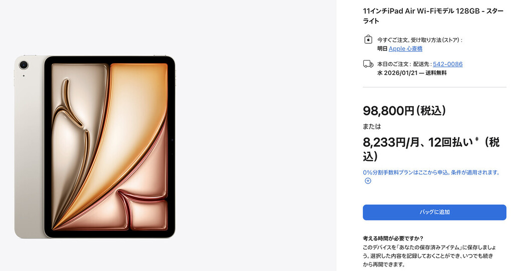 現行のiPad Air M3(11インチ/128GB)の定価は98,800円(税込)。