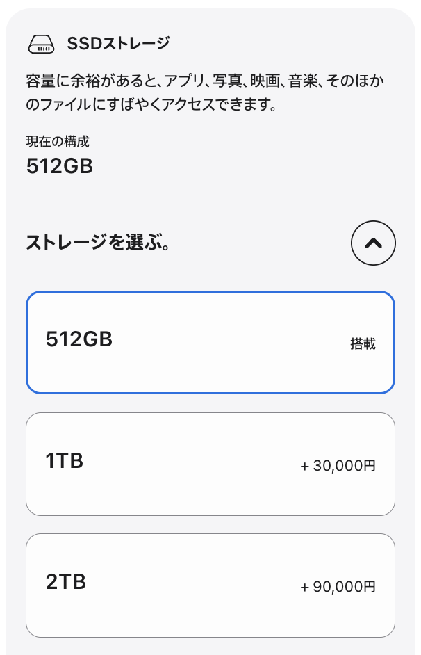 - 【リターン】 16GBメモリ構成の場合、たった「+11,000円」でストレージが2倍(1TB)になる。