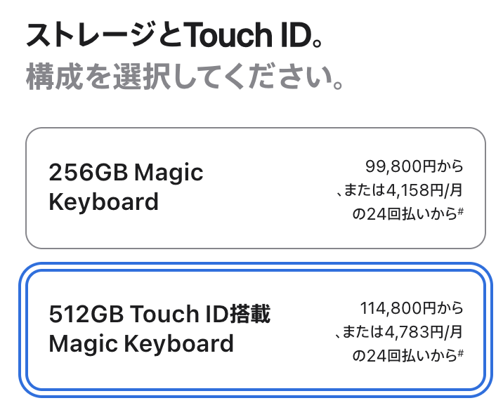 しかし、ここにAppleの巧みな価格設定が隠されています。MacBook NeoでTouch ID搭載モデルを選ぶと、SSD 512GBへの増量がセットで必須となり、価格が一気に114,800円まで跳ね上がってしまうのです。