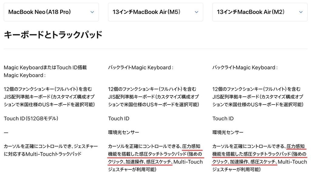 - トラックパッドはマルチタッチには対応していますが、感圧タッチには対応していません。