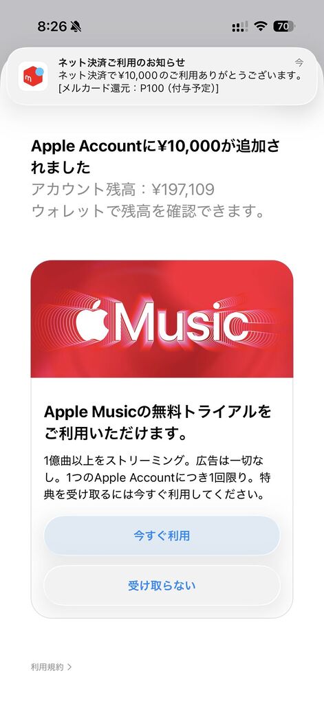現在メルペイでは、Appleアカウントへのチャージで10%還元されるキャンペーンが実施されています。結論から言うと、2月8日(日)の「メルカードの日」にチャージするのが最もコスパが良いです。