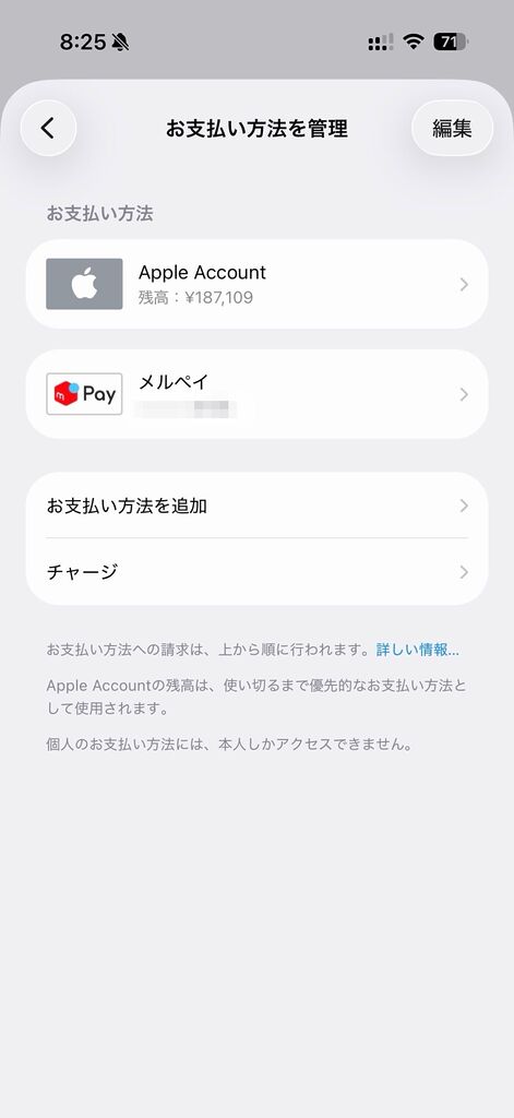 iPhoneの「設定」>「Apple ID」>「メディアと購入」>「お支払い方法を管理」から、メルペイを一番上の支払い方法に設定する。