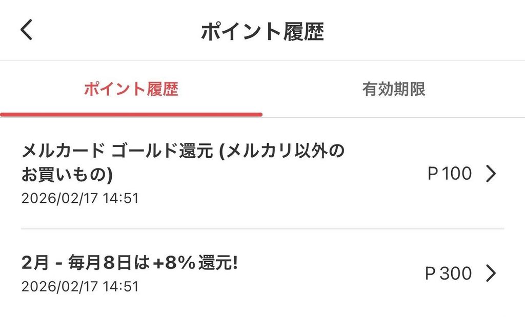 論より証拠です。2月17日に付与されたポイント履歴をご覧ください。「2月 – 毎月8日は+8%還元!」として300Pが付与されました!!