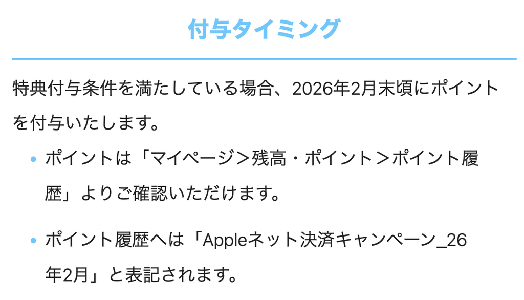 - 結論:Appleサービスの10%還元(2026年2月末付与予定)に加え、毎月8日の+8%(上限300P)も適用!