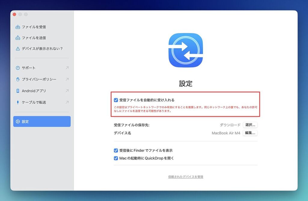 みうラボ・アドバイス 「自動受け入れ」は非常に便利ですが、カフェなどの公共Wi-Fiではオフにするか、設定画面下の「信頼されたデバイスを管理」で自分の端末だけを許可するようにしておくと安心ですよ。