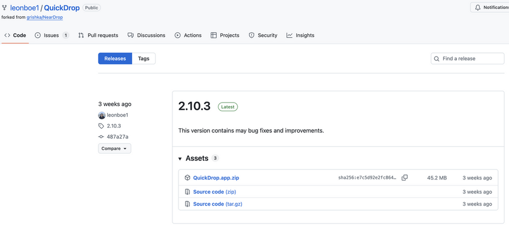 1. GitHubからダウンロード Leon Boettger氏の公式GitHubの「Releases」ページから、最新のQuickDrop.app.zipファイルをダウンロードします。