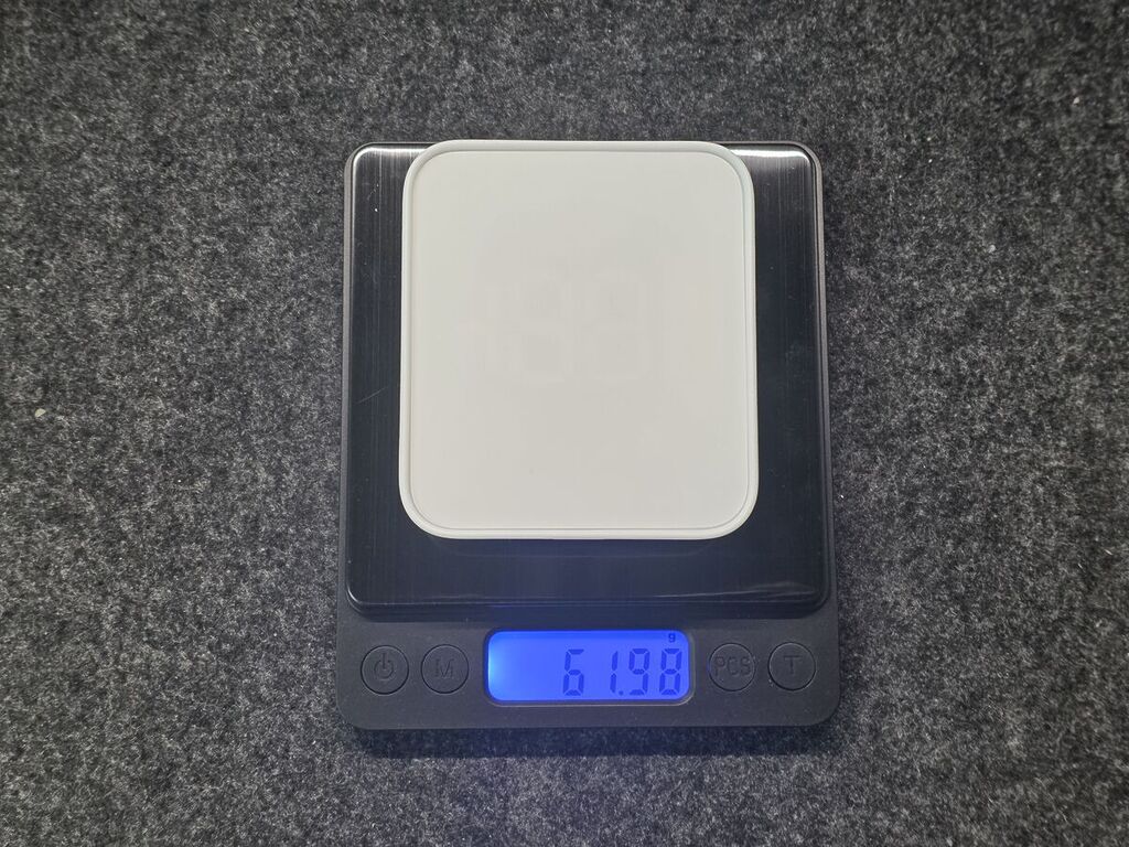実測重量は61.98g。非常に軽量です。これなら壁掛けしても負荷はほとんどありませんね。