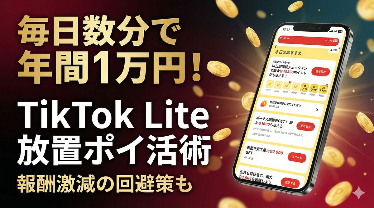 毎日のポイ活は「いかに手間をかけずに、大きなリターンを得るか」が全てです。 その点において、TikTok Liteの「チェックイン+放置の動画視聴」で年間1万円超えというスペックは、現状他の追随を許しません。