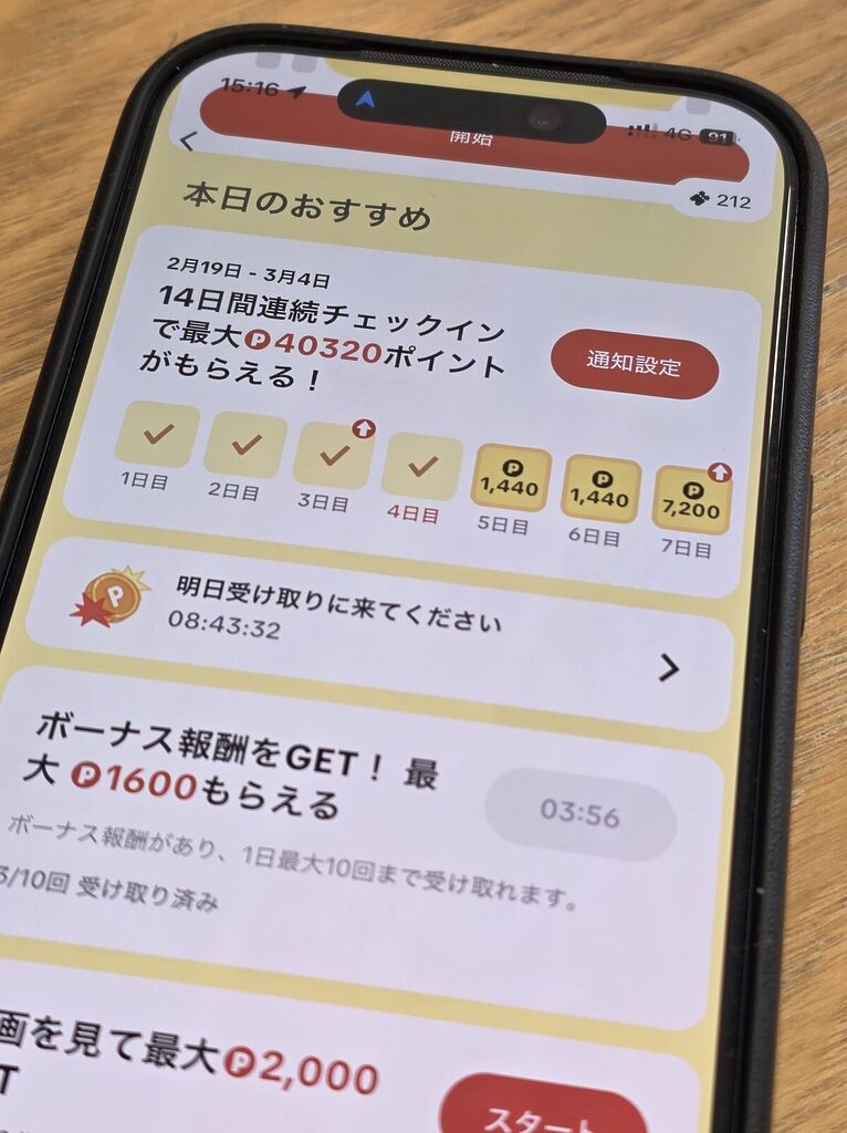 私の端末の場合、14日間連続チェックインで「最大40,320ポイント(403円相当)」となっています。特に14日目の報酬が「14,400ポイント(144円分)」と跳ね上がるため、1日でも忘れると大きなロスになります。