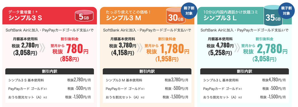 | Y!mobile (シンプル3 M) | 30GB | 1,958円 | おうち割光セット+PayPayゴールドカード割適用時 |